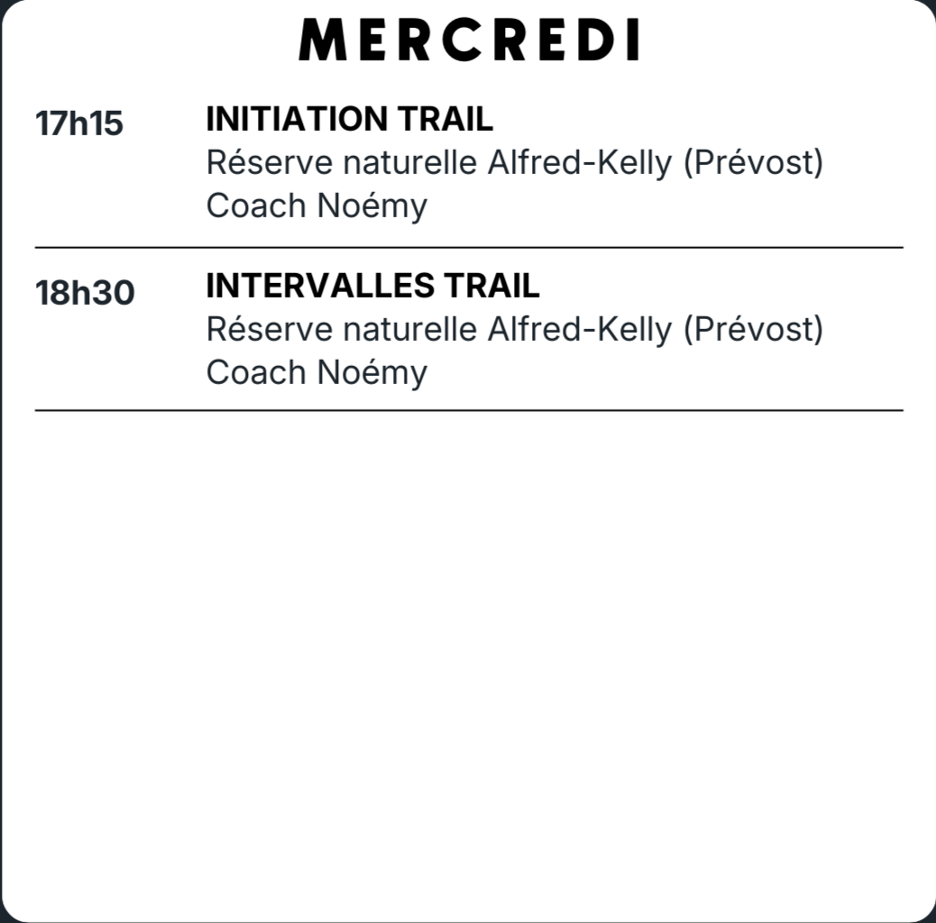 Intervalles course, intervalles trail et initiation trail : 195 $ + taxes